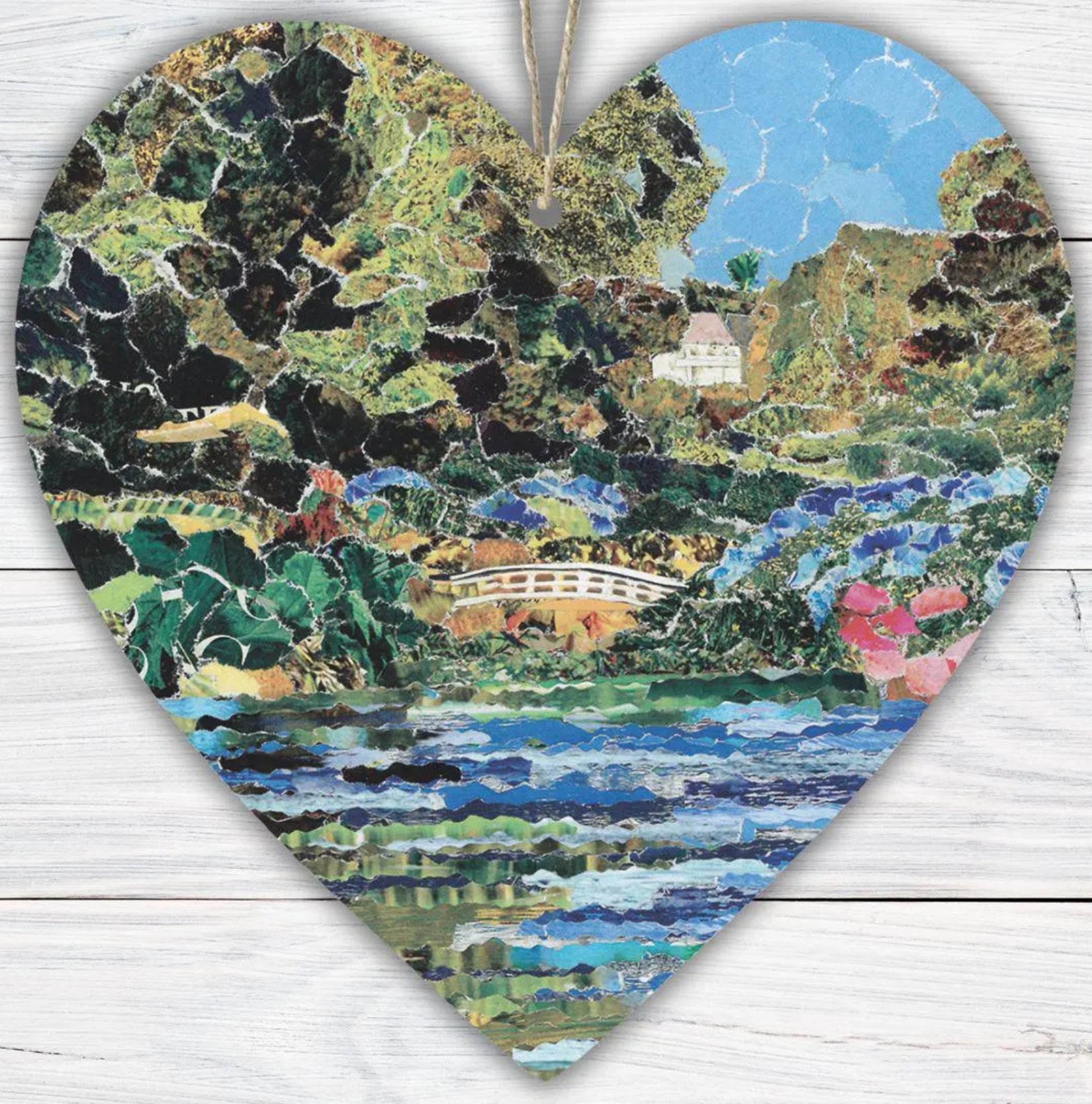 Trebah Garden Hanging Heart – Botanical Collage Art from Cornwall on Double Sided Wood with String – Handmade Nature Keepsake Gift