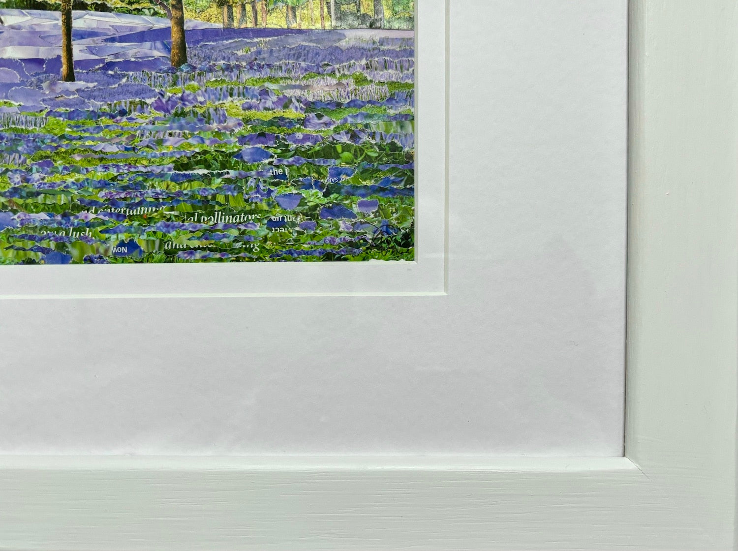 Discover the captivating beauty of Enys Gardens with Cathy Harrison's original paper collage, exclusively available at Junk Mail Art. This unique piece, crafted from upcycled magazines, vividly portrays the vibrant bluebells of Cornwall. Measuring 9" x 7" and framed in a bespoke 17" x 15" white wooden frame, this eco-friendly artwork blends sustainability with stunning visuals. Ideal for eco-conscious art lovers and collectors, it combines environmental responsibility with artistic excellence. Enhance your collection with this distinctive and sustainable piece, celebrating the natural charm of Enys Gardens. Perfect for those who appreciate unique, handmade art with an eco-friendly touch.